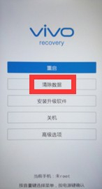 1、将手机关机,同时按住“电源键”和“音量上键”,直到呈现“vivo”再松开,手机主动进入“recovery模式”,然后“断根数据”。
