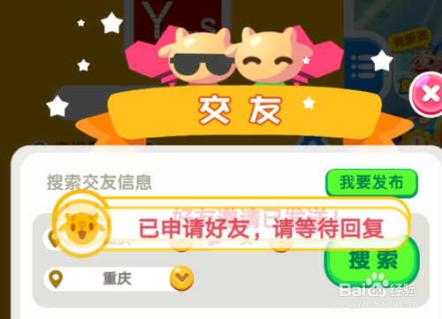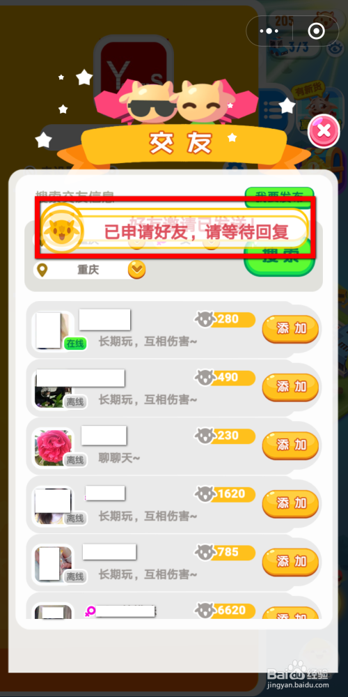 选择好前提今后,点击图示位置【搜刮】按钮,搜刮成果会显示鄙人方的列表中,在列表中选择你想添加的老友,点击玩家名称后面的【添加】按钮,即可申请添加。