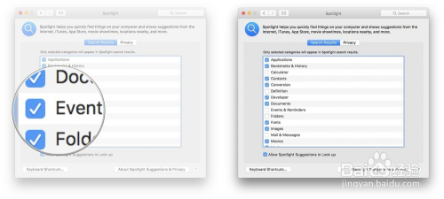 4、单击类别旁边的复选框以更改Spotlight将显示的内容。若是它有复选标识表记标帜,那么将显示这些成果; 若是没有,那么这些成果将不会显示。