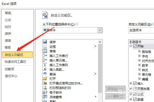 第三步:在选项菜单中,我们找到:自界说功能区 的选项,因为我们要将开辟者选项固定到功能区。