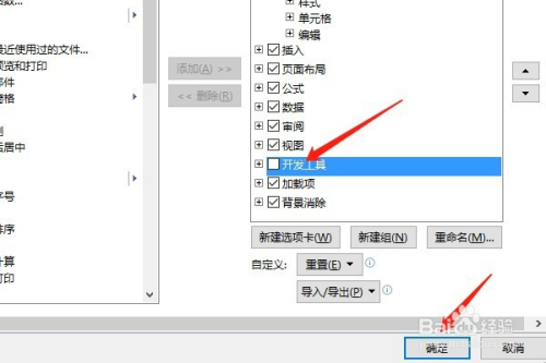 第四步:我们进入了自界说功能区之后呢,我们可以看到右侧有个菜单,里边就有:开辟者选项,今朝处于未选中状况。我们将其选中,然后点击确定。