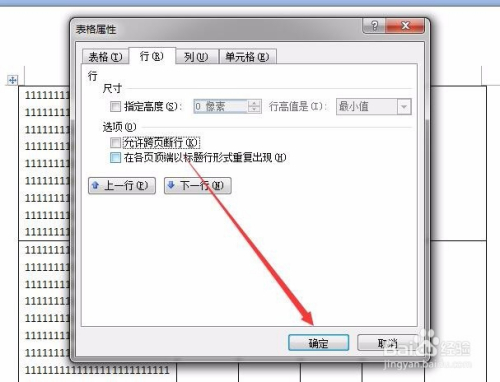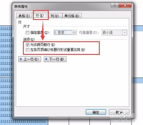 在表格属性的行属性中,我们就可以看到许可跨页断行属性是默认选中的。
