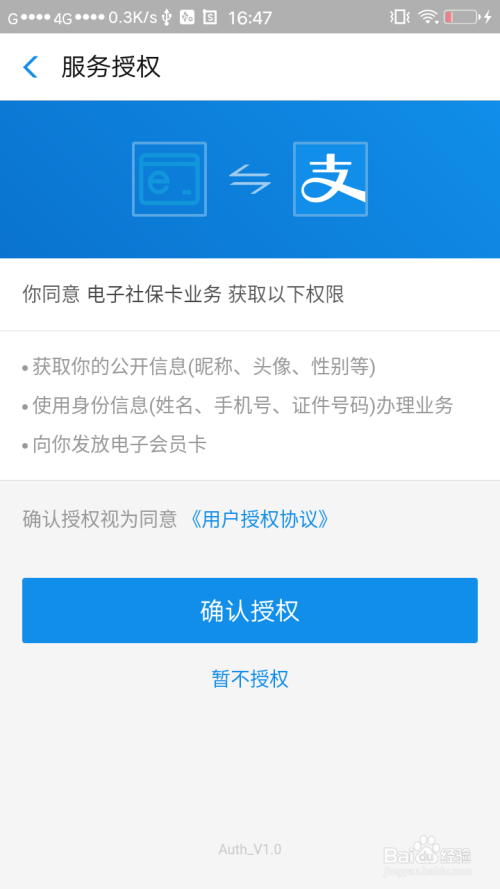 然后会呈现办事授权字。点击确认授权。过程会查对头像,因为我之前绑定了,所以无法截图这部门内容,绑定后就能查询到社保卡的环境。