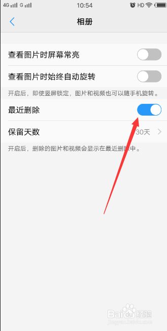 然后可以看到,在相机页面中,比来删除右侧的开关默认是封闭的,点击打开,可以设置具体的时候。