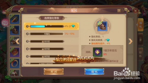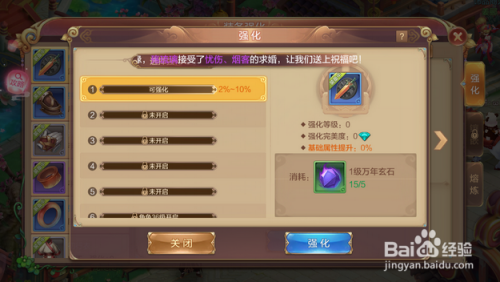 第四步,在【强化】界面,我们看到,该装备的第一个品级可以进行强化,每强化一次需要【万年玄石】5块。只要有【万年玄石】我们就可以点击下方的【强化】按钮进行强化了。