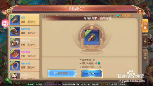 第三步,我们打开【强扮装备】界面,先在界面的左侧选中一个装备,然后在右侧点击【强化】按钮即可进行该装备的强化。