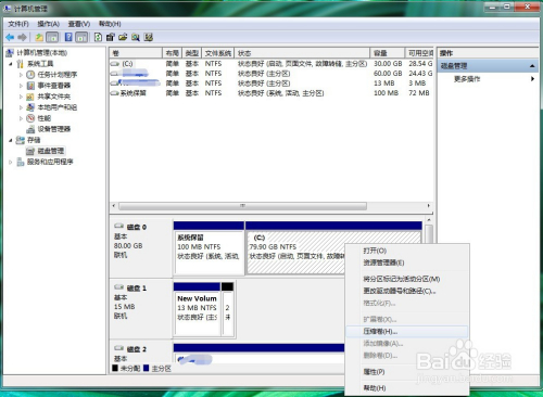 右键单击磁盘,在弹出的菜单中找到压缩卷(或扩展卷),此号令的是意思是将该磁盘进行朋分,如图所示。