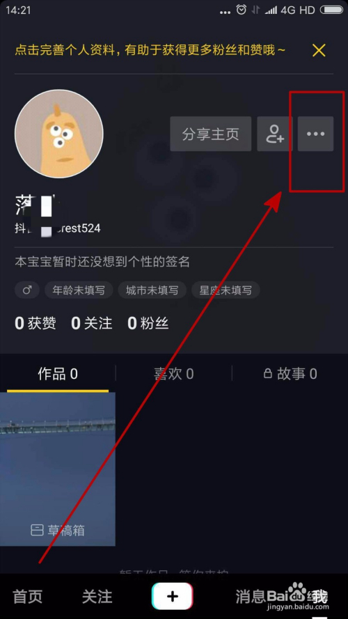 在我的抖音可以查看和编纂本身的抖音账号信息,我们点击右上角附件的“···”按钮。