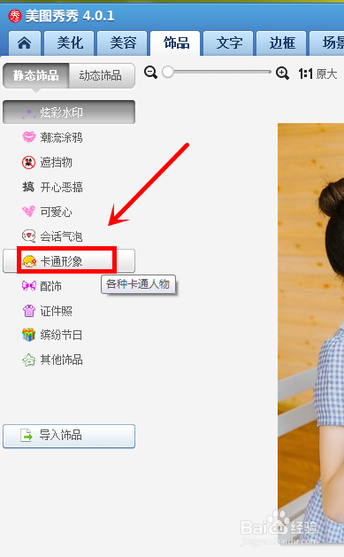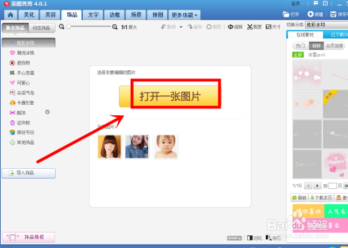 在电脑上打开安装在电脑上的图片编纂软件,如美图,在打开的页面中选择饰品模块编纂;