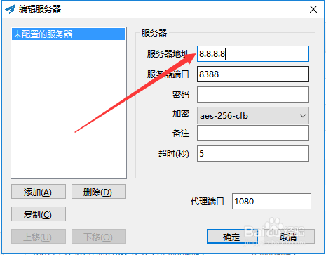 在如图标识表记标帜的位置,需要输入ss办事器的IP地址;