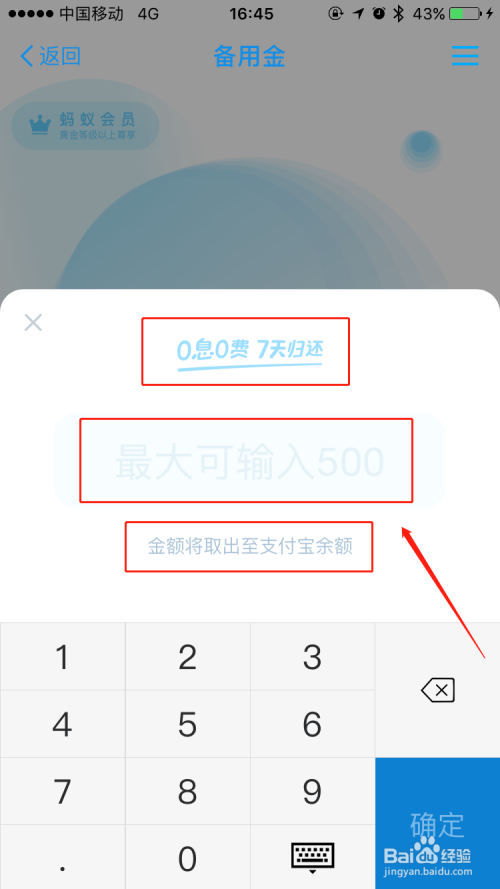 这是我们可以看到取用备用金须知:备用金500元,0利钱0费用,每月可以领取2次,偿还后方可再次取用,借后7天主动偿还,可提前偿还。阅读完之后我们进入取用界面,输入金额(最年夜可输入500),点击确定,备用金就掏出至付出宝余额了
