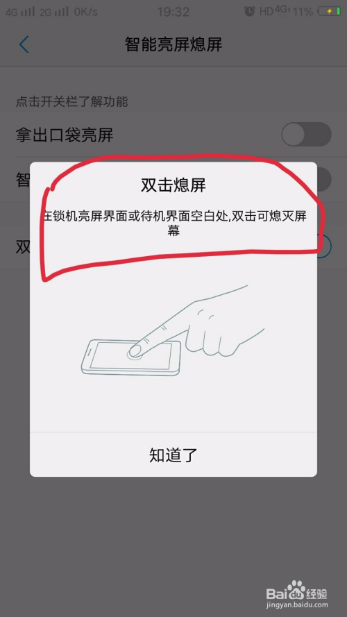 你可以点击双击熄屏的文字,它会有一个演示申明,只要在桌面上面双击两下,就处于锁屏状况了。