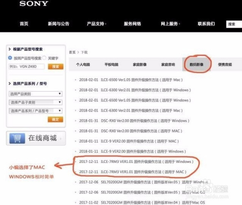 进入下载页面选择“数码影像”,接着查找对应的相机型号;然后选择合适你的电脑系统的固件安装(有进级的内容介绍);分歧的系统安装体例也略有分歧;本文介绍选择了MAC系统做演示,而Windows系统相对简单一些。