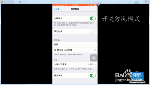 这里有良多设置项目→开(绿色)、关(灰色)勿扰模式(来电设置为静音)。