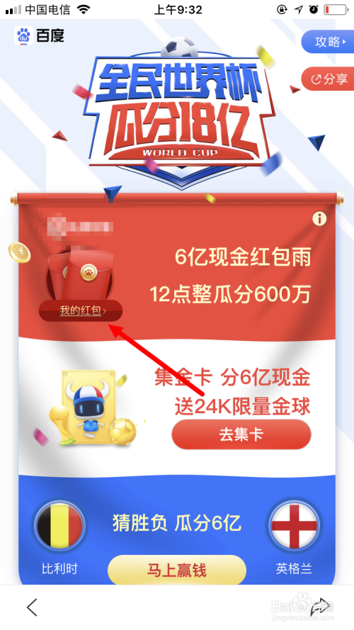 进入下图所示的页面后,可以看到第一个就是 6亿现金红包雨 活动的图片,点击 我的红包 。