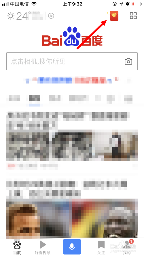 首先在手机上打开并登岸百度App,并在首页面点击右上角的红包图标。