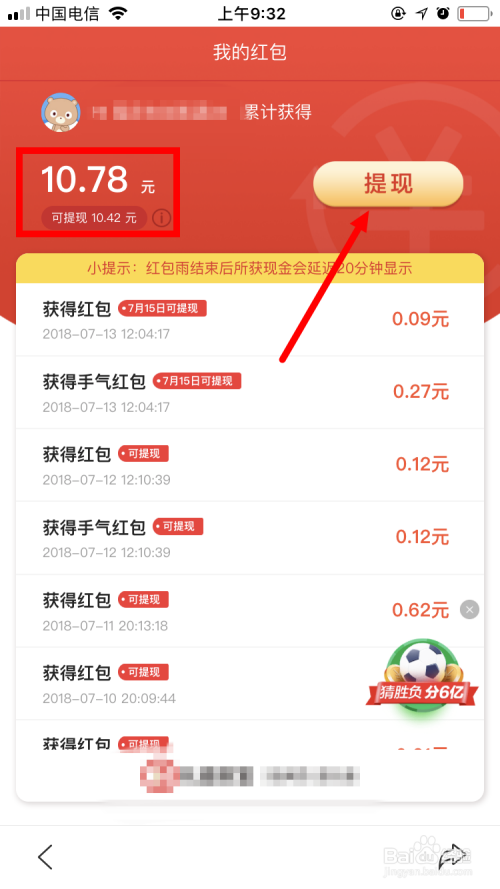 然后会进入 我的红包 的页面,左上角可以看到本身已经获得的现金红包总额和可提现金额。点击右边的 提现 。
