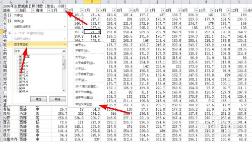 此刻我们按照前提来筛选 例如前提是:"1月"日照时数年夜于等于100,那么我们必定点击的是1月份的下拉列表符号,选择数据筛选中的自界说筛选