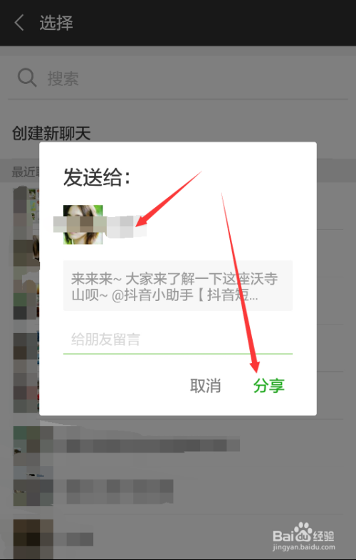点击后弹出发送抖音视频给微信老友的弹窗,直接点击【分享】,如下图所示。