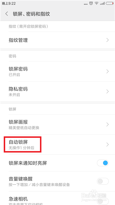点击后在接下来的界面中找到【主动锁屏】选项,鄙人面可以看到今朝小编设定的主动锁屏时候为1分钟,点击主动锁屏。