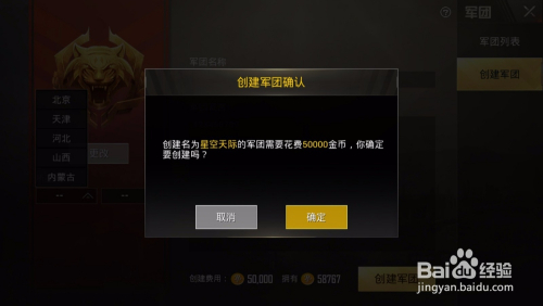 在这里会提醒你,建立军团需要耗损50000金币,知足金币的,那就直接确定。