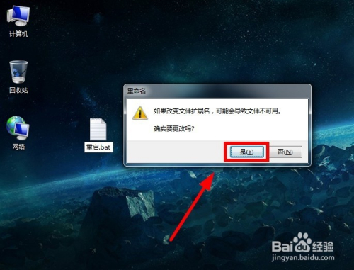然后将文本文档重定名为“.bat”文件,输入“重启.bat”,按“Enter”键确定更改