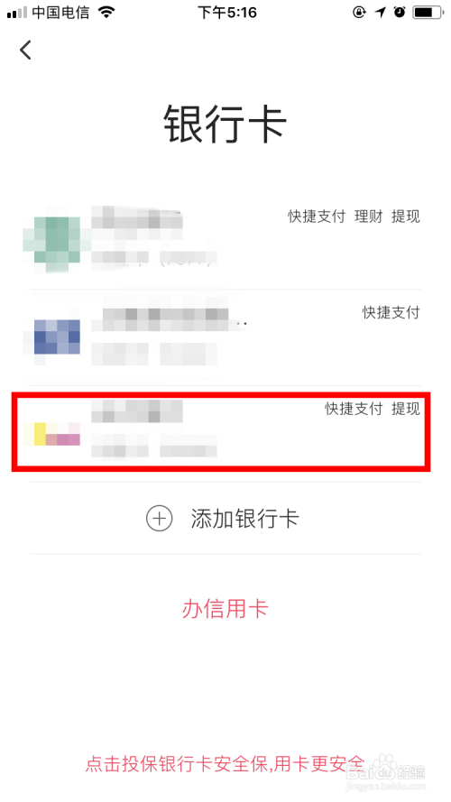在银行卡页面可以看到所有已绑定的银行卡,以及各张银行卡的权限,好比提现、理财、快捷付出。点击想要解绑的银行卡。