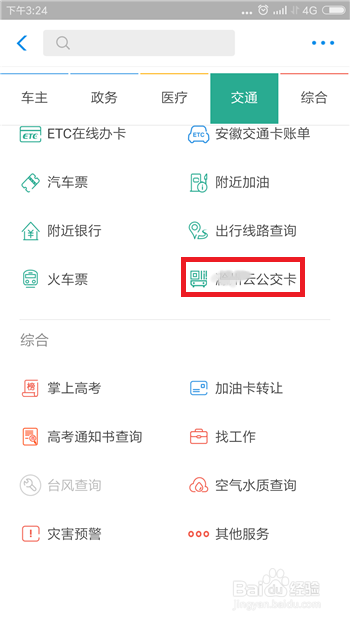 点击后在交通选项下方找到【云公交卡】,这里就是打点云公交卡的进口,点击一下。