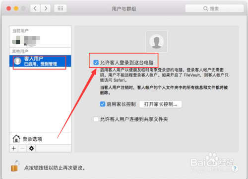 接着点击界面左边的【客人用户】,然后勾选【许可客人登录到这台电脑】就能启用客人账户了。