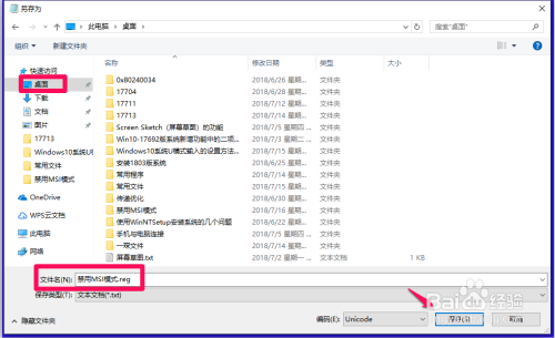 在打开的另存为的窗口中,先点击窗口左侧的【桌面】,在文件名(N)栏中输入:禁用MSI模式.reg,再点击:保留;