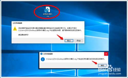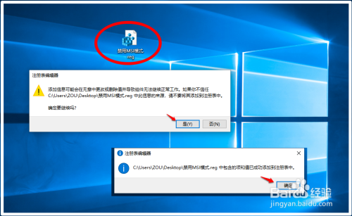 我们在系统桌面上找到并左键双击:【禁用MSI模式.reg】注册表文件图标,在先后弹出的注册表编纂器对话框中点击:是(Y)和确定;
