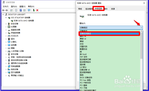 在打开的 尺度SATA AHCL节制器 属性窗口中,点击:具体信息,再点击属性框中的小勾,鄙人拉菜单中点击选择【设备实例路径】;