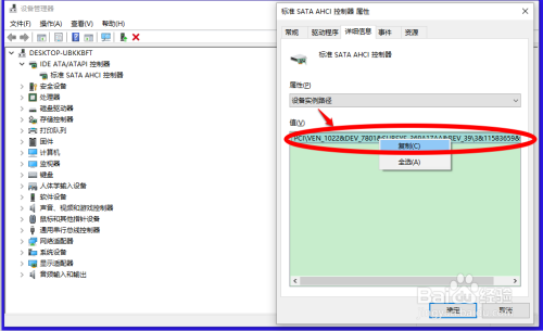 尺度SATA AHCL节制器 属性窗口【值】栏中值即:设备实例路径,复制记下