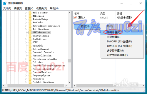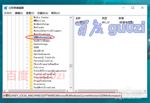 在注册表编纂器中,从HLM键起头,按照图中的最下方的信息,依次找到OEMInformation,
