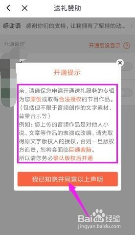 点击后,页面会呈现开通提醒,若是我们的作品合适要求,就点击【我已知晓并赞成以上声明】。开通后,按钮就酿成红色了~
