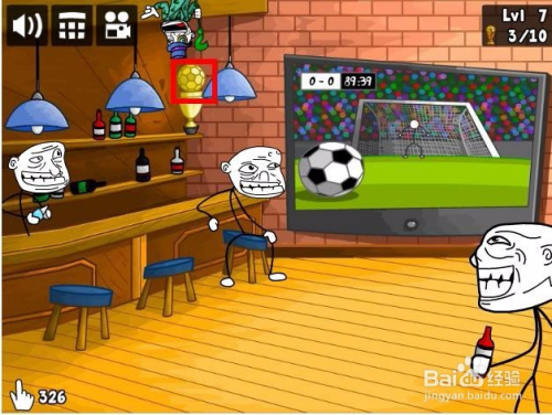 打开游戏第七关,游戏的场景是几小我在看电视,电视里是足球角逐,这个时辰点击左侧角落奖杯上的一个金色足球。