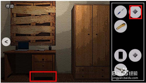 接着点击右侧的衣柜,在衣柜下方的抽屉,在左面的抽屉点击会获得一个手工刀,具体如图标识的处所。
