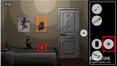 切换参加景1,床上猫的右侧有个盒子,点开后是个图形拼图,按照手机图形的线索摆列,拼好之后获得一个门上的菱形碎片。