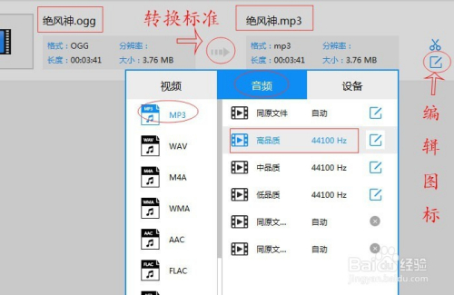 点击转换尺度右边的编纂图标在音频格局里面找到mp3格局选择音频取样频率,小编选择的是高品质。