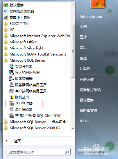 首先打开从Microsoft SQL Server里打开企业办理器;如下图所示