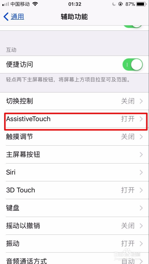 再接着,我们进入到【辅助功能】之后,点击【AssistiveTouch】,如图所示。