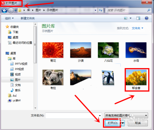 这时在电脑桌面上会看到打开图片选项框,我们按照图片存储的位置找到图片并选择,随后点击选项框下的打开即可;