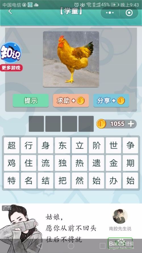 怎么看图片中的鸡,都是一只很正常的鸡,只是颜色是金黄色的,谜底是“金鸡自力”,技击上的一种招式。
