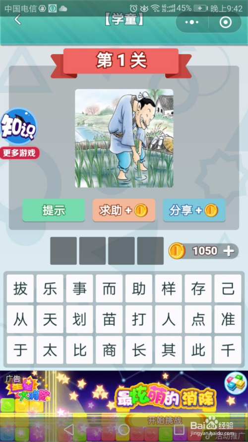 如下图所示,第1关里,只有图像信息,没有文字,一个农民在拔庄稼。