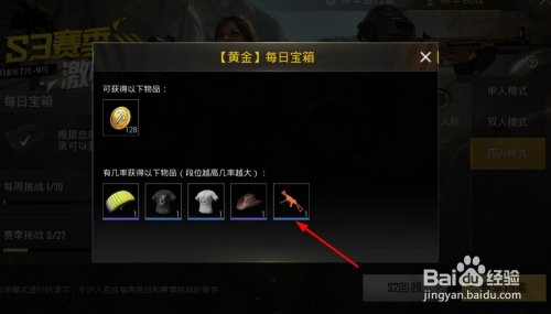每日宝箱里可以获得128的金币,可是UMP9赤橙色的皮肤可遇不成求的,获得的几率跟着你的段位越高,几率也就越年夜,好好加油升段吧