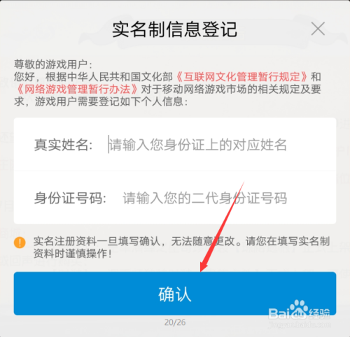 接着需要进行实名认证操作,必需是本人的真实信息才可以经由过程,随便输入的话是不成以的哦。输入完当作后,点击底部确认按钮。