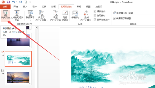 然后就起头录制了,在录制的过程中,点击播放幻灯片即可,可以按照需要点击,暂停等,然后可以按照需如果否配上配音;录制好之后,可以点击左上角的 从头起头 菜单来查看。