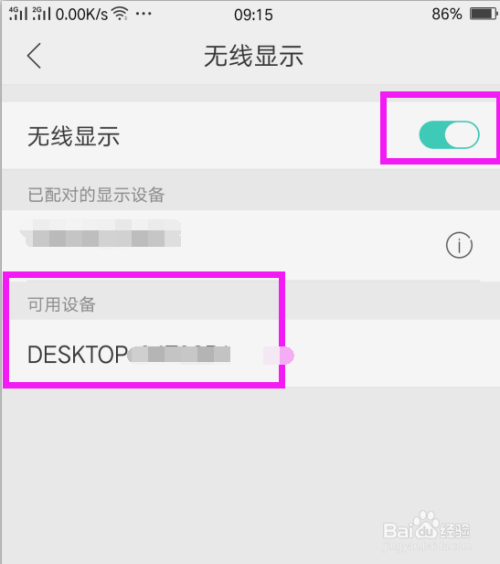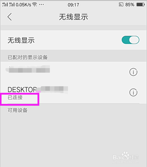 打开无线显示开关,鄙人面系统就会主动寻找可用设置,呈现可用设备之后,点击这个设备名称