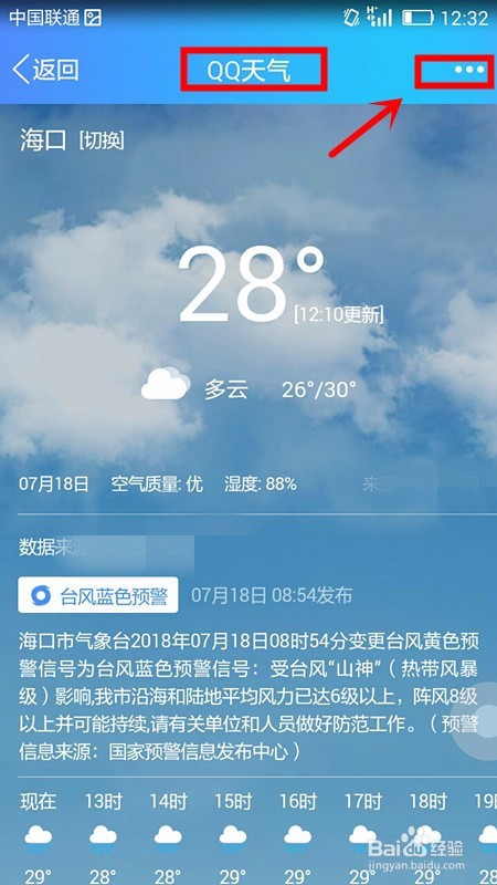 接下来就会看到QQ气候页面了,从页面中可以知道当天各个时段的气候状况,点击该页面右上角三点图标;