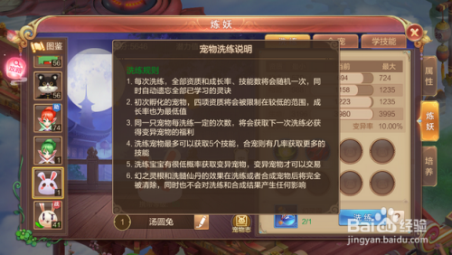 第四步,点击【洗炼】按钮边上的【?】号,查看洗炼具体内容及要求,如下图所示。宠物宝宝只有颠末洗炼之后变异才能被买卖,也只有变异宝宝才能进行【合宠】操作。